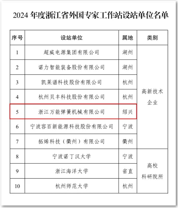 Năm 2024, công ty TNHH máy móc lò xo vạn năng Chiết Giang vinh dự là doanh nghiệp duy nhất được chọn tại thành phố Thiệu Hưng, một lần nữa giúp thành phố Thiệu Hưng giành được vinh dự. Thành tích này không chỉ khẳng định chiến lược đổi mới công nghệ, phát triển quốc tế của công ty mà còn đánh dấu bước tiến mới về năng lực cạnh tranh toàn cầu.