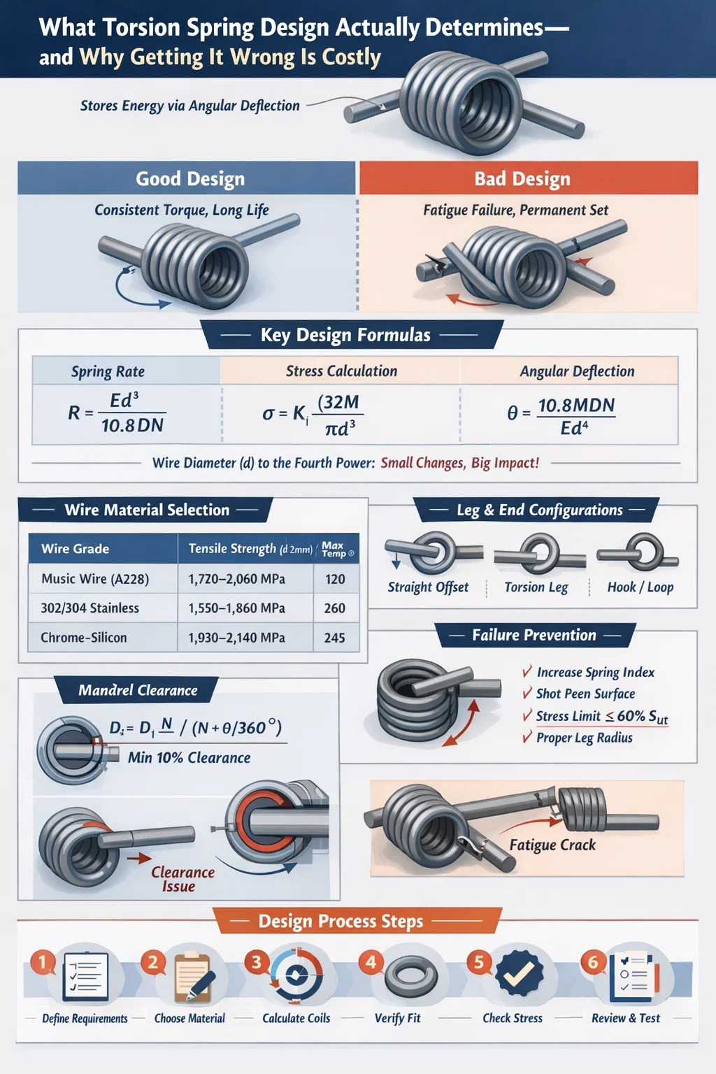 Thiết kế lò xo xoắn là quá trình xác định hình dạng, vật liệu, đặc tính tải và dung sai chế tạo của lò xo dự trữ năng lượng thông qua độ lệch góc thay vì nén hoặc giãn tuyến tính. Hãy thiết kế phù hợp và lò xo sẽ mang lại mô-men xoắn ổn định qua hàng nghìn — hoặc hàng triệu — chu kỳ. Làm sai, bạn sẽ phải đối mặt với hiện tượng mỏi sớm, cố định vĩnh viễn hoặc đường cong mô-men xoắn không thể đoán trước làm hỏng cơ cấu hạ lưu.