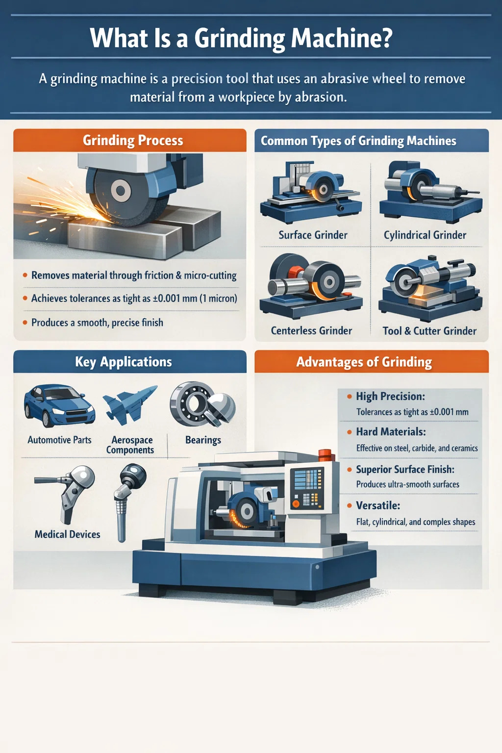 Máy mài được nhúng sâu vào việc sản xuất các bộ phận chính xác trong hầu hết mọi ngành công nghệ cao. Dưới đây là một cái nhìn về nơi mài quan trọng nhất: