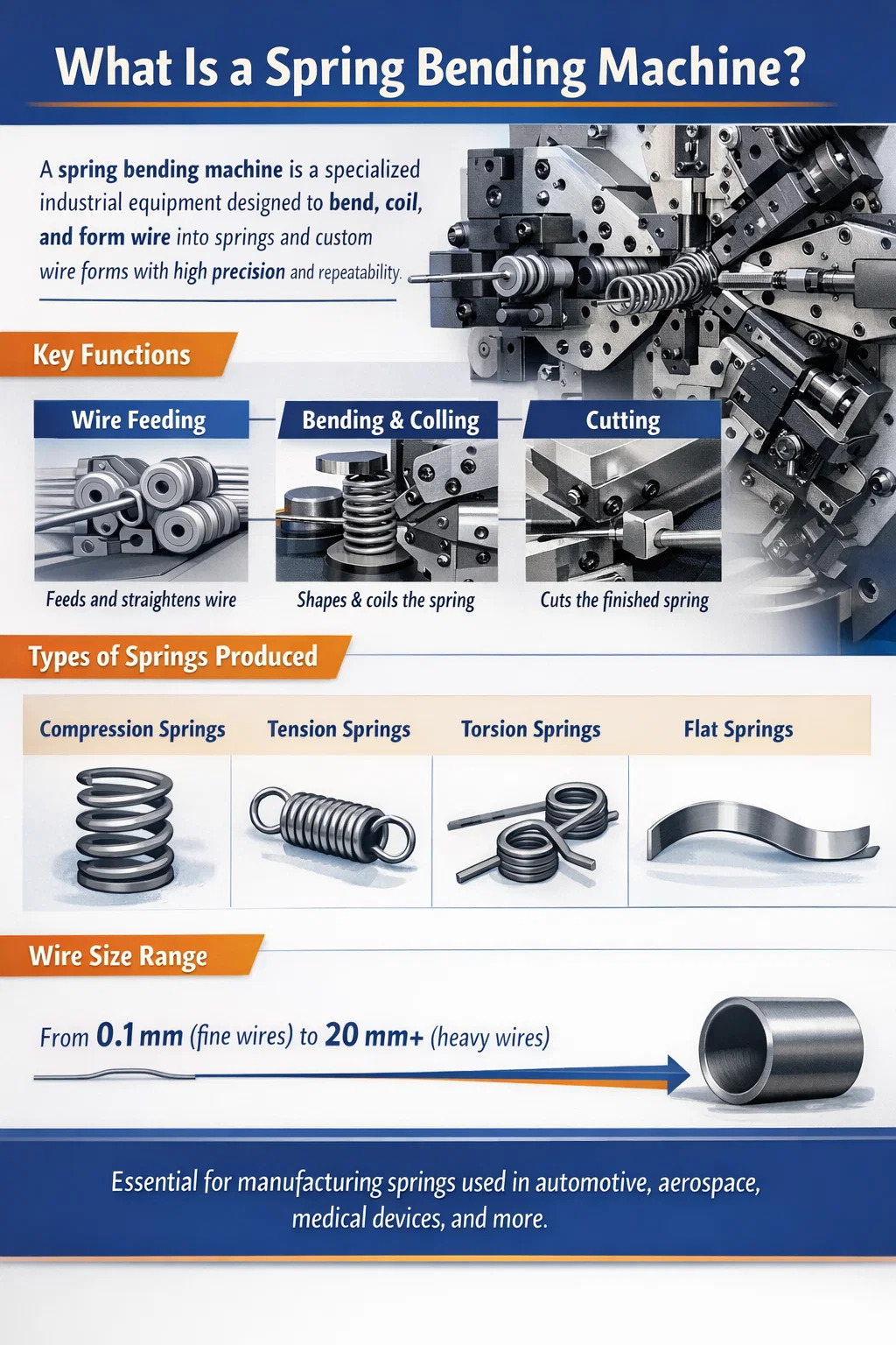 Ngành công nghiệp sản xuất lò xo toàn cầu rất đáng kể. Lò xo được sử dụng trong hầu hết mọi sản phẩm cơ khí - từ bút bi và thiết bị y tế đến hệ thống treo ô tô và bộ truyền động hàng không vũ trụ. Thị trường mùa xuân được định giá hơn 24 tỷ USD vào năm 2023 và máy uốn lò xo là công cụ sản xuất chính tạo ra sản phẩm này. Hiểu những máy này là gì và cách chúng hoạt động là điều cần thiết đối với bất kỳ ai tham gia vào quá trình sản xuất, mua sắm hoặc thiết kế kỹ thuật lò xo.
