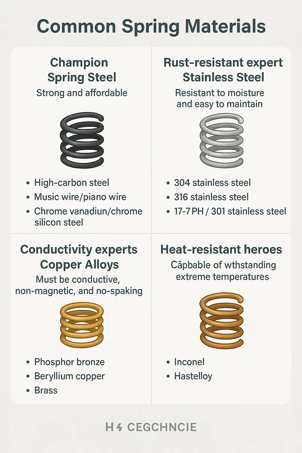 Việc chọn loại kim loại phù hợp cho lò xo tùy thuộc vào yêu cầu ứng dụng – nó sẽ chịu được lực bao nhiêu? Nó sẽ rỉ sét? Môi trường làm việc có nóng không? Nó có cần dẫn điện không? Dưới đây là đặc điểm của các vật liệu thường được sử dụng: